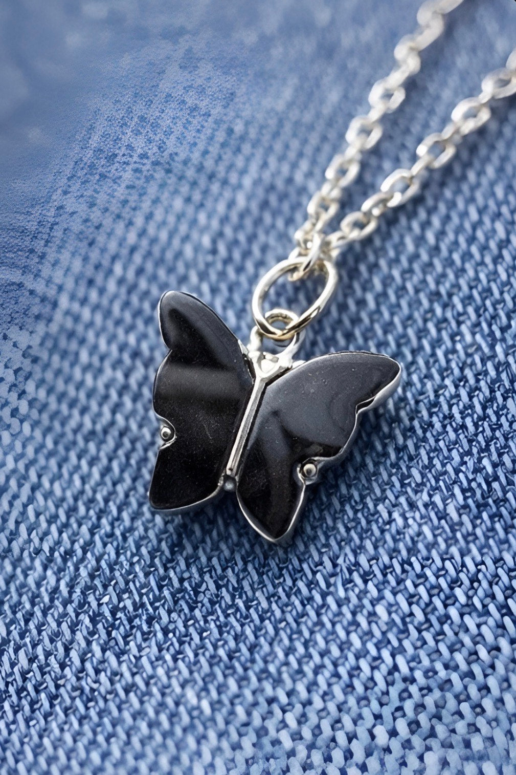 Add a touch of graceful charm to your look with this black butterfly pendant necklace. Featuring a sleek butterfly-shaped charm in a deep black finish, this piece symbolizes transformation, freedom, and beauty. The pendant is suspended from a classic silver-tone chain, creating a striking contrast that is both modern and timeless.