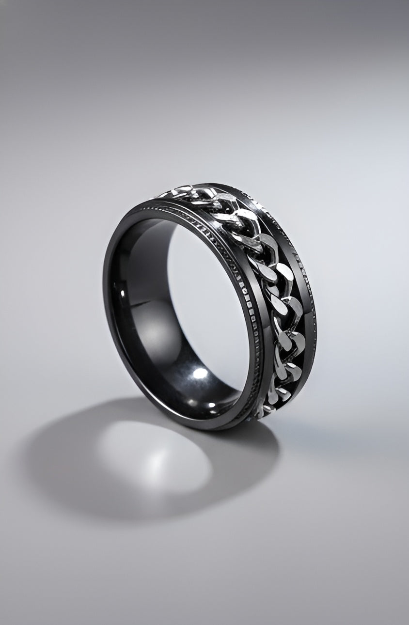 Bold and unapologetically refined, this stainless steel ring features a striking chain-link inlay set between polished black edges. The detailed chain design symbolizes strength, unity, and resilience, giving the ring a powerful presence without sacrificing elegance. Crafted for durability and everyday comfort, its smooth interior fit and high-polish finish make it ideal for daily wear or meaningful occasions. A perfect statement ring for those who value confidence, craftsmanship, and modern masculinity.