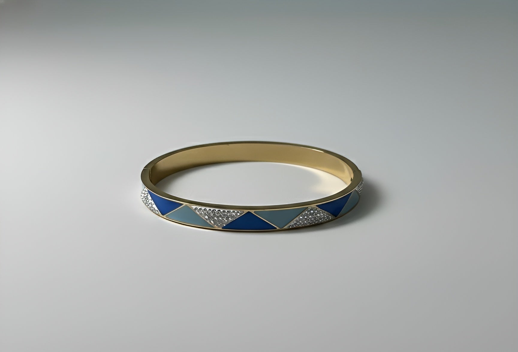 The Azure Mosaic Gold Bracelet is a refined blend of modern artistry and timeless elegance. Crafted with a polished gold-tone finish, this bracelet features a striking geometric enamel pattern in rich blue hues, accented with subtle textured detailing for added depth and brilliance.