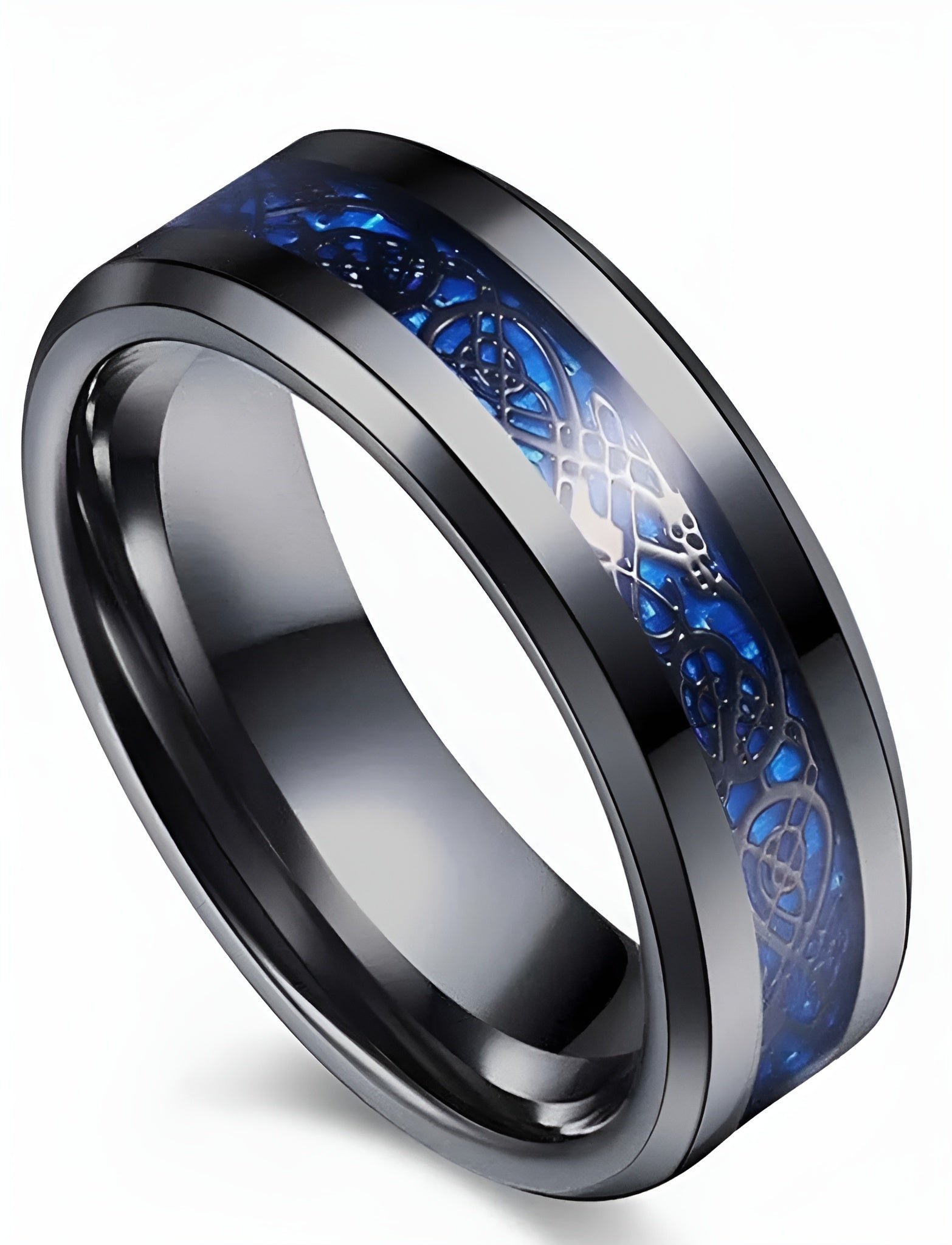 A sleek black band infused with a radiant sapphire-blue Celtic weave, blending ancient symbolism with modern sophistication.
